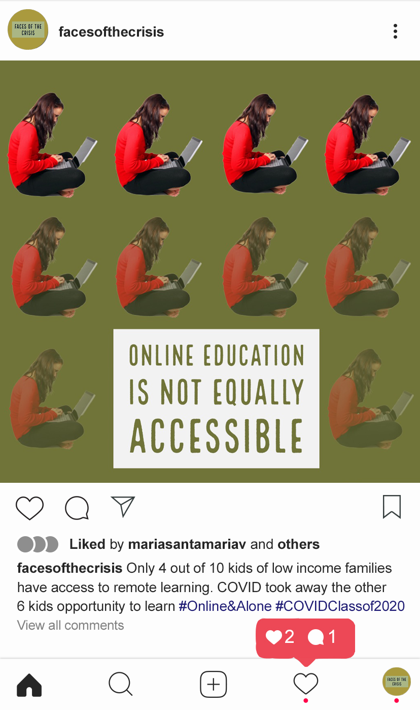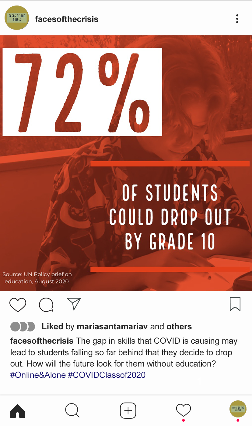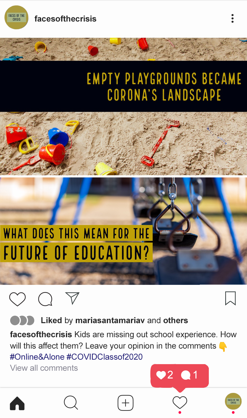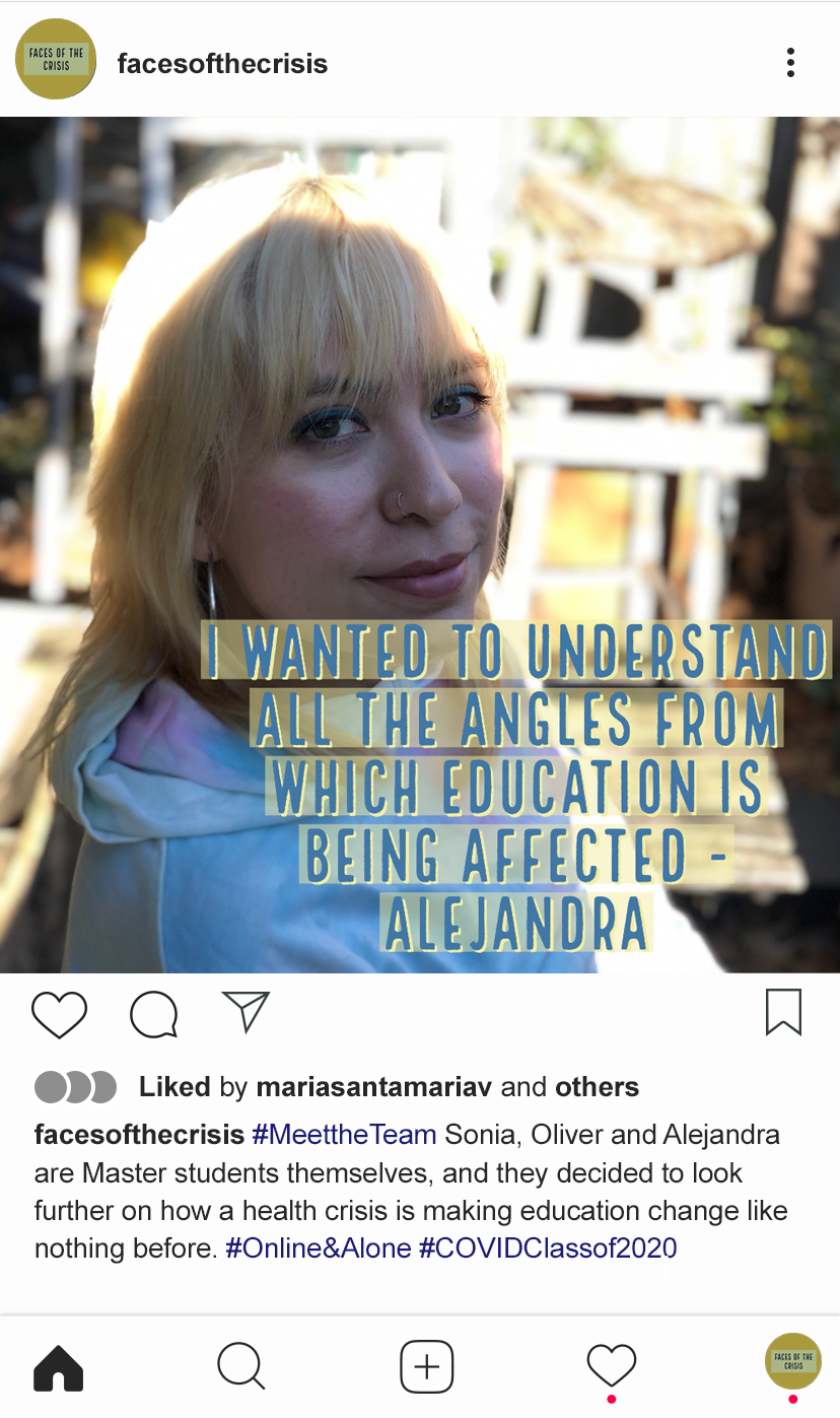 We all contributed to the different parts of the project, but I was in charge of the social media strategy. I wanted to use distinctive typography and a palette of colors to help create a brand identity for ‘Faces of the Crisis.’ I also generated different types of content for Instagram, aiming to engage the audience, provide them with important information and raise attention towards our different products as results of the project.